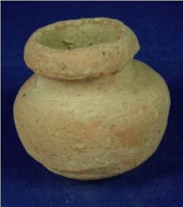 | Description / विवरण | Coarse terracotta vessel pot with oval base, bulbous body, low neck and narrow mouth. The rim is thick and averted. |
