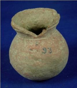 | Description / विवरण | Coarse terracotta pot having a low narrow neck, averted rim, bulbous shaped body and a flat circular base. Body below rim is coordinated. |