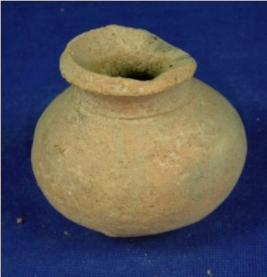| Description / विवरण | Coarse terracotta miniature pot having a narrow high neck with averted rim, bulbous body and a flat circular base. A deep striation mark is seen below the neck. |