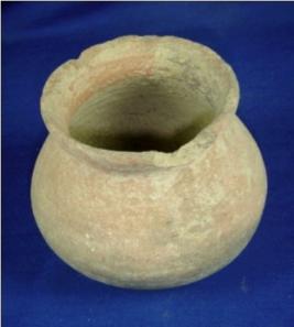 | Description / विवरण | Coarse terracotta vessel - pot with oval base, bulbous and spherical body, low neck and a broad mouth. Its rim is thick and averted and partly broken. It is ill fired, signified by its colour and core. |