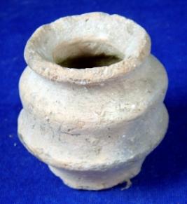 | Description / विवरण | Terracotta tiny vessel, jar with flat circular base, body is carinated on lower and upper part, averted rim with broad mouth. |