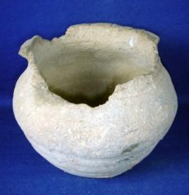 | Description / विवरण | Terracotta vessel- pot with irregular flat circular base, bulbous body decorated with spiked wheel mark, broken averted rim. |