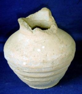 | Description / विवरण | Terracotta vessel of pot with flat circular base bulbous body carinated at waist and has thick sparse striation marks, low neck with broken rim. |