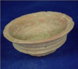 | Description / विवरण | Terracotta bowl with flat and circular base, shallow depth and thick rim. The body is flared with sparse striation marks. |