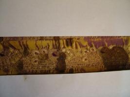 | Description / विवरण | Silk trimming, embroidered, yellow ground. Pattern-white peacock with purpole wings in a shrub. |