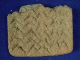 | Description / विवरण | fragment of tablet with a rough surface. It is broken in two halves and has many incised lines on side. It was probably used as a scrubber. |