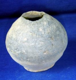| Description / विवरण | Terracotta pot, coarse, ill fired, with neck and rim missing, circular body, and pedestal base. Clay incrustation all over. Its rim part is broken. |