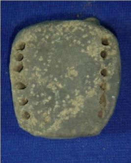 | Description / विवरण | Flat rectangular terracotta tablet, with round edges. One surface has two large holes while the surface opposite to it has two rows of small incised holes. |