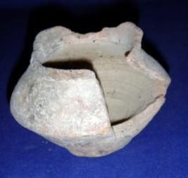 | Description / विवरण | Ill fired terracotta pot, it has flat base and sharp carination at the waist part. Some part of the waist is broken most of the rim part broken, prominent striation marks are seen on the surface. |