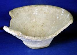 | Description / विवरण | Broken terracotta bowl, coarse, thick in fabric, with inverted rim, flayed body with corrugation works and flat, circular base. Exterior contain deep depression. Clay incrustation all over. |