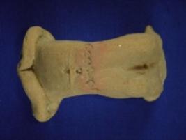 | Description / विवरण | Terracotta female figurine, head is missing. Her hands are in namaskara mudra and her body is tilted towards back side in a bow shape. The waist band is clearly visible. |