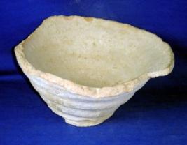 | Description / विवरण | Broken terracotta bowl, coarse, thick in fabric, with inverted rim, flayered body with corrugation marks and flat, circular base. Exterior contain deep depression. Clay incrustation all over. |