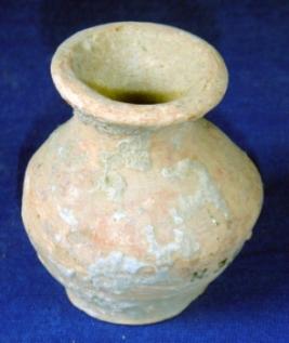 | Description / विवरण | Terracotta tiny vessel- pitcher with flat circular base, highly carinated body, low neck with averted rim but broad mouth. |