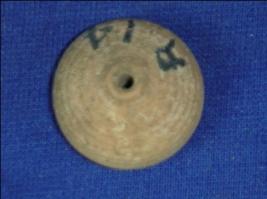 | Description / विवरण | Terracotta bead betel nut shape with a perforated hole at the centre, wheel marks are visible on the body. |