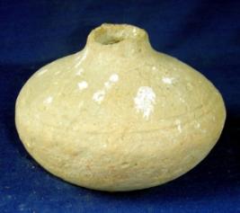 | Description / विवरण | Small terracotta pot, coarse, with missing rim, probably had long narrow neck, circular body with deep incised lines at the centre and round oval base. |
