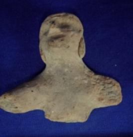 | Description / विवरण | Upper part of the body of a terracotta human figurine. The whole body below chest is missing and hands are broken from arm. His head is covered and face is tilted backward. Its facial features are not prominent, only nose is visible. |