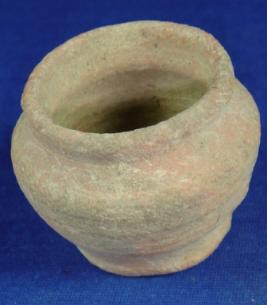 | Description / विवरण | Terracotta, coarse vessel - tiny pot with broad mouth, featureless rim, with concavity below, round body, which is descending towards base and broad circular, flat base. The upper body has a carination mark. The diameter of the rim is more than the base. |