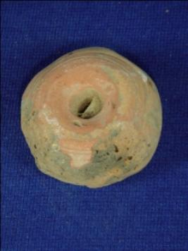 | Description / विवरण | Terracotta round bead with flat ends. There is a hole across the body. One side has three circular lines and other side is flat. Portion of the body is weathered having small pores. |
