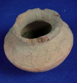 | Description / विवरण | Coarse, ill fired miniature pot having flat base, carinated body, averted rim, normal mouth opening, it has been restored while excavation. |