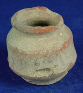| Description / विवरण | Coarse terracotta vessel - tiny pot with broad mouth, averted rim with concavity below, round body and broad, flat and circular base. There are two carination marks, one each on upper and lower portion of the body. The diameter of the base is more than the rim. The rim is partly broken. |