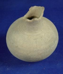 | Description / विवरण | Fine, ill fired pot having rounded base, bulbous body, high neck with striation mark below neck, featureless rim, narrow mouth. |