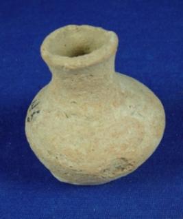 | Description / विवरण | Crudely finished, well made, well fired miniature pot having circular, flat base bulbous body, high neck, featureless rim. |