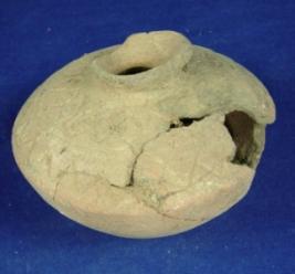 | Description / विवरण | Terracotta vessel - pot having circular base, bulging body with sharp carination mark, decoration with wavy lines and geometric lines on the upper part. |