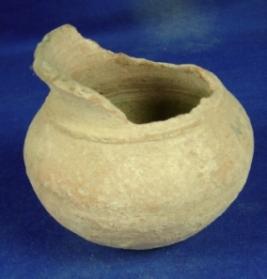 | Description / विवरण | Coarse terracotta pot with circular base, bulbous body and slightly vertical rim which is broken. |