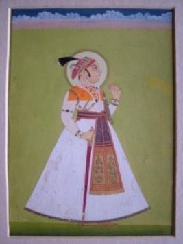 | Description / विवरण | Aurangzab emperor is standing on a green ground with sword in his left hand and long flower in his right hand wearing a white circular chola and green halo behind his hand. |