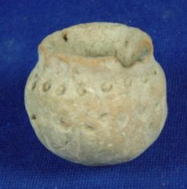 | Description / विवरण | Plain, coarse terracotta vessel - miniature pot with featureless rim which is partly broken, round body with incised dot designs and round base. |