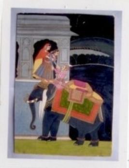 | Description / विवरण | Sultan Gauhar Shah Shahzada is sitting on an elephant. He is trying to taking up a lady, the lady is helped by another lady. The elephant is decorated with designed cloth. |