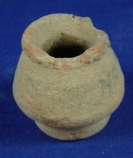 | Description / विवरण | Plain, coarse terracotta vessel - pot with averted rim which is partly broken, bulbous body and carination marks on the waist and circular footed base. |