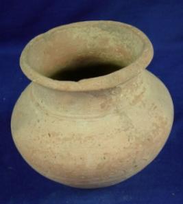 | Description / विवरण | Plain, coarse terracotta vessel - pot with averted rim, bulbous body and flat circular base, having striation marks on neck and lower portion of the body. |