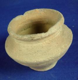 | Description / विवरण | Terracotta, coarse vessel - small lota with broad mouth, averted rim with concavity below, round body and footed, circular and flat base. The diameter of the rim is more then the base. The upper body has a carination mark. The rim is flaking off. |