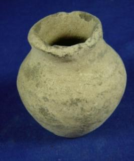 | Description / विवरण | Plain, coarse terracotta vessel - pot with featureless rim which is partly broken, bulbous body and flat base. Clay incrustation all over. |