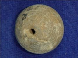 | Description / विवरण | Terracotta bead betel nut shape with perforated hole at the centre. |