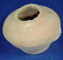 | Description / विवरण | Plain, coarse terracotta vessel - pot with broken rim, bulbous and tapering body and flat circular base, there are close carination marks in interior of the body. |