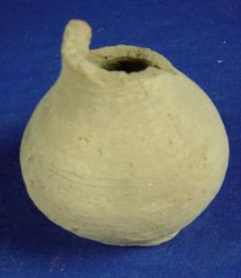 | Description / विवरण | Coarse terracotta vessel - tiny pot with narrow neck, bulbous body and broad, circular, flat base. The neck is broken. |