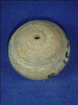 | Description / विवरण | Terracotta bead with one side narrow and flat and other side in conical shape. It has a perforated hole in the centre. |
