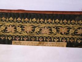 | Description / विवरण | Border, silk embroidered black ground. Pattern-white, purple, gold silk thread flowers in floral pattern. |