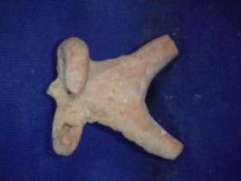 | Description / विवरण | Terracotta human figurine. It has pinched head. Hands are folded in front of the chest, but the right hand is half broken. The left leg is broken at the end. Portion of drapery is partially visible. There is a hole across the body. |