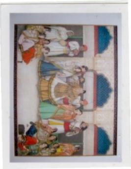 | Description / विवरण | The painting depicts a group of prostitutes either sitting or standing, wearing decorative & ornamental cloth. The head of the group is standing in the middle with musicians. In foreground there are total nine prostitutes sitting on the ground five in right colour & four in the left. This others are smoking Hukka . In background there are such shaped door through which sky is visible. It has well decorated border. |