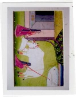 | Description / विवरण | The painting depicts a lady sitting under a cow and departing milk from cow s breast & with other hand she is pointing forwards coming boat. Other lady is standing and holding calf. In background there are hut, trees, green field & river & blue sky. The painting is made in Alwar Style. |