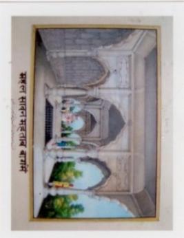 | Description / विवरण | The painting depicts part of Mahal palace, which has eleven pillars. There is a basement in the middle. In right side of the painting trees are there. Some men are also there standing and staring trees and back side of the Mahal, which has another building. The colour used in Mahal is brown and the colours used in trees are yellow & green. In backside, there is sky in blue colour. |