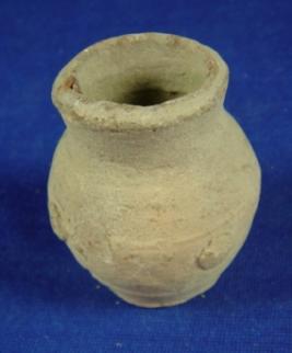 | Description / विवरण | Simple terracotta coarse vessel - tiny jar with averted rim, round body and flat circular base |