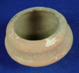 | Description / विवरण | Coarse, ill fired terracotta pot with round, flat base with carination at the middle part of the body and at top, it has broad mouth and featureless rim. Clay incrustation is seen all over the body. |