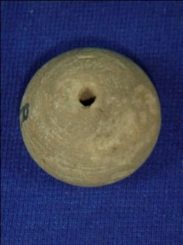 | Description / विवरण | Plain terracotta bead in conical shape. The wheel marks are visible and slightly broken at one side. It has a perforated hole in the centre. |
