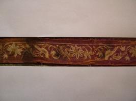 | Description / विवरण | Silk trimming, embroidered, red ground. Scroll pattern of light blue, green and purple flowers between white birds with green wings and yellow beaks. |