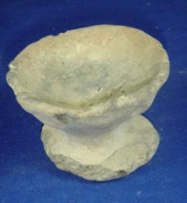 | Description / विवरण | Plain, ill fired, coarse terracotta vessel - bowl with stand, hand made, flayed sides, tapering ends and stand with flat circular base. Clay incrustation all over. |