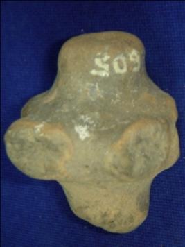 | Description / विवरण | Terracotta bead in cylindrical shape, with six arms protruding out from the middle portion. Four arms and completely broken and two are partially broken. It has a perforated hole in the centre. |